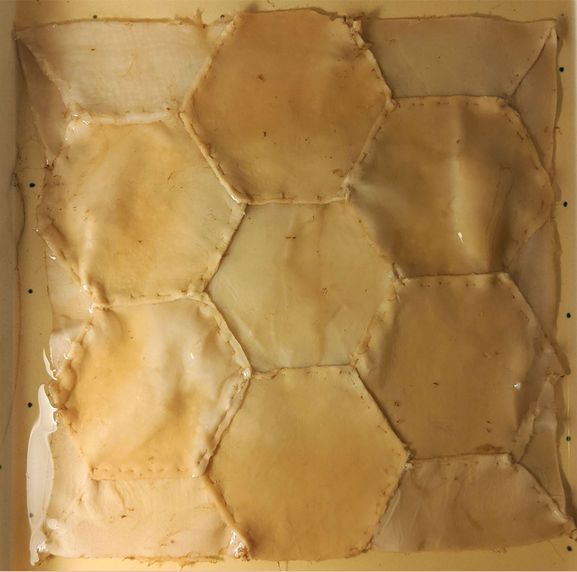 My mom was a quilter when I was a child. She has lost this skill due to the progression of her neurological degenerative condition, called Huntington’s Disease. Quilting is something I wish she could teach me, but because she is no longer able, I am forced to adapt. Luckily, kombucha SCOBY accommodates my lack of true sewing skills. when overlapped while drying it sticks together, so there is no need for sewing. As a material, the SCOBY is relevant to her disease in that it is generational, just like Huntington’s is. As her daughter, this is something I have a 50/50 chance of inheriting from her. It’s hard to watch someone lose all of their hobbies and skills, and sense of self. To cope with this trauma, I outsourced my care to a group of women I knew through my neighborhood and church community. A lot of these women were self-proclaimed granola girls, and were into kombucha way before it hit the shelves of Whole Foods. Eating together was a common occurrence with these women. This piece is a homage to them, and the pieces of the quilt will be shaped as hexagons, like honeycomb, to represent hive mentality and collectivity, as well as interconnectedness.
